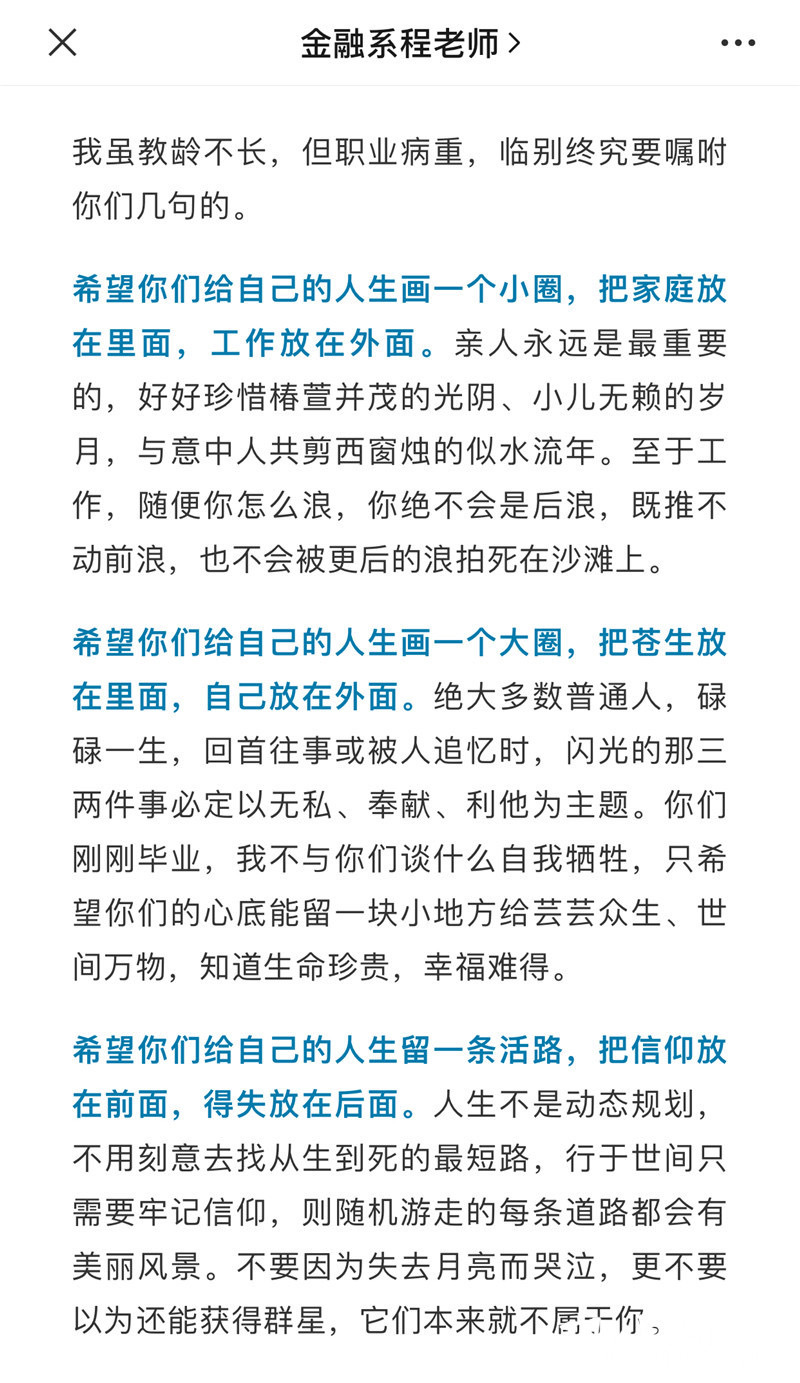程欣炜老师是冰球突破mg正规官网金融系教师,2016级金融工程专业的班主任。四年里,程老师和学生们共同度过了300多个课时和无数课外时光,被学生们亲切地称作“宝藏老师”。由于上半年的疫情,2016级学生大都未能返校,并以线上方式完成了答辩,这样的毕业缺少了仪式感,增添了未能相聚的遗憾。答辩结束那天,程老师在自己的公众号里写下了一封饱含深情的送别信,以此为嘱托,希望孩子们“给自己的人生画一个小圈,把家庭放在里面,工作放在外面”,“给自己的人生画一个大圈,把苍生放在里面,自己放在外面”,“给自己的人生留一条活路,把信仰放在前面,得失放在后面”,“给自己的人生邀三两同路,把施恩放在心间,感恩放在嘴边”,谆谆寄语中,是老师对学生们的美好祝福和期待。很多学生读完后潸然泪下,为老师的用心和“大爱”感动,也为自己遇上这样的老师倍感庆幸。