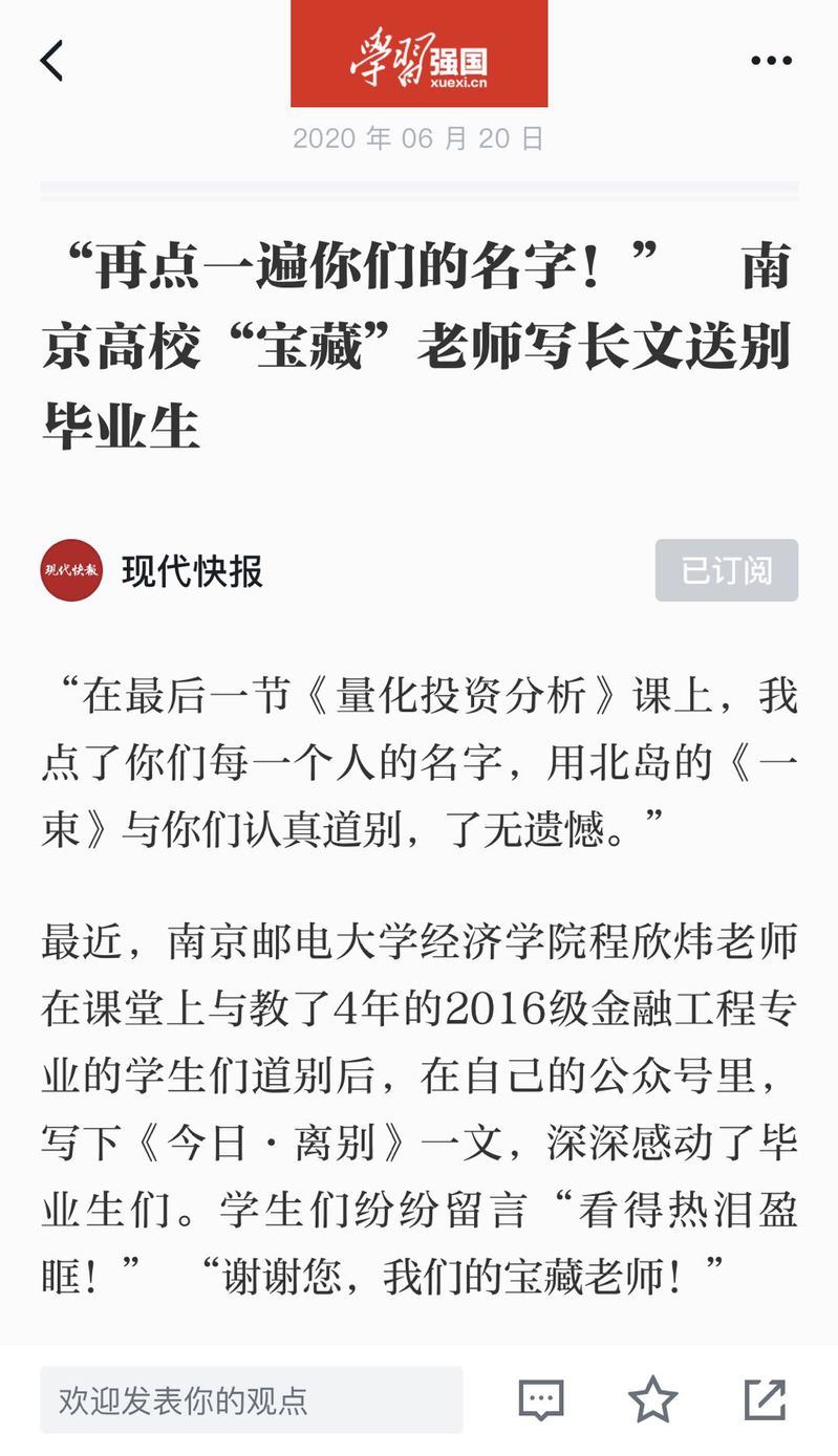 近日,冰球突破mg正规官网程欣炜老师写长文送别毕业生事迹获交汇点新闻、现代快报等媒体的报道,学习强国现代快报订阅号也转载了这则新闻,引起广泛关注和热议。
