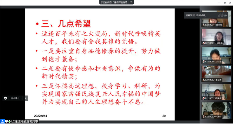 2022年9月14日上午,冰球突破mg正规官网2022级新生举行校史校情专题教育。会议邀请到了校、院两级关工委副主任储成祥教授,储教授以“传承红色基因,争做新时代精英”为主题进行了校史校情专题讲座。会议由冰球突破mg正规官网2022级本科生辅导员储宜旭老师主持,2022级全体本科新生线上参会。
