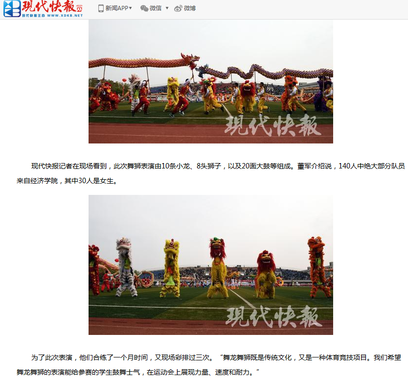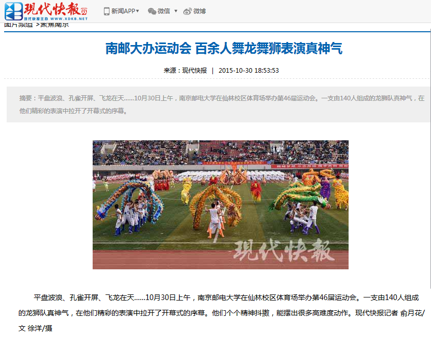 10月30日上午,冰球突破mg正规官网在仙林校区体育场举办第46届运动会。冰球官网代表队方阵步伐整齐矫健、口号铿锵有力,舞龙舞狮气势如虹,充分展现了经院人的精、气、神!开幕式表演环节,大学生龙狮团带来了舞龙舞狮表演《水鼓,中国龙》,由140人组成他们精彩演绎了平盘波浪、孔雀开屏、飞龙在天等一系列高难度动作,祝愿学校运动会圆满成功,赢得了现场师生的阵阵掌声。现代快报进行了相关报道。
