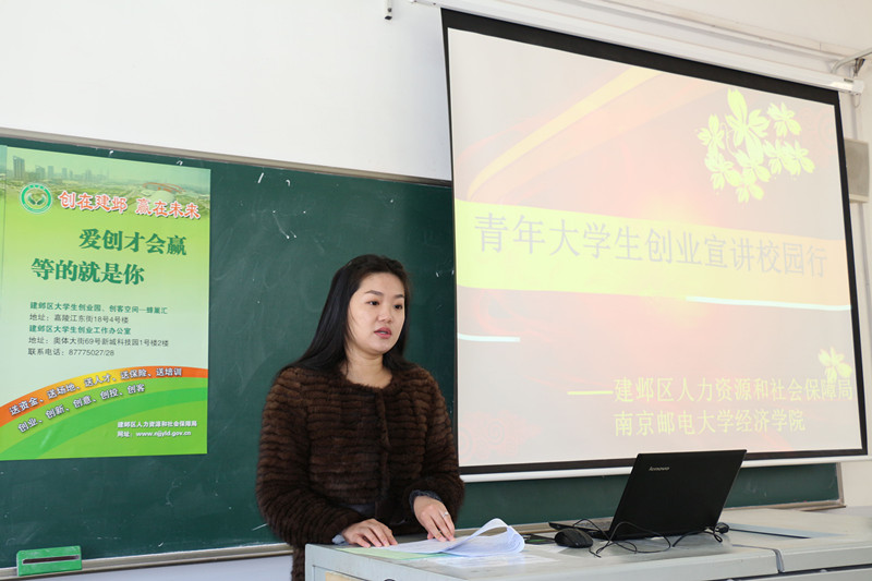 11月27日,冰球官网邀请了建邺区创业导师吴思雨为同学们进行创业宣讲。建邺区人力资源和社会保障局的陈婷、曹旌女士莅临本次活动。冰球突破mg正规官网党委副书记董军、分团委书记吴波出席了本次创业宣讲会。冰球突破mg正规官网对创业有兴趣的同学参加了本次活动。