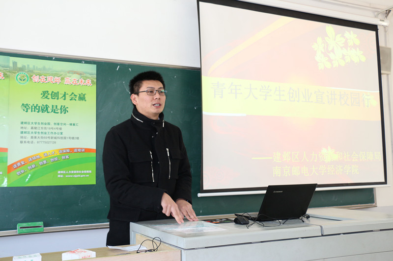 本次活动由分团委书记吴波老师主持。他向大家介绍了到场嘉宾,并说明了活动的重要意义。建邺区人社局相关负责人曹旌女士为大家全面地讲解了当前的创业情况,并传达了建邺区大学生创业的相关政策。创业导师吴思雨作了重要演讲。他简要讲述了自己的创业经历,重点指导同学们如何参加创业大赛,掌握答辩技巧,赢取创业奖金。他强调,一份完整的创业计划书、一个良好的资金运作计划和项目的应用价值十分重要。