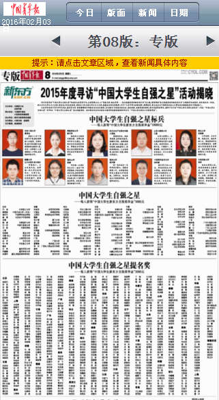 《中国青年报》(2016年02月03日08版)刊登报道,冰球突破mg正规官网冰球突破mg正规官网王海飞同学荣获2015年度“中国大学生自强之星提名奖”以及“中国大学生新东方自强奖学金”,我校仅王海飞同学1人入选。
