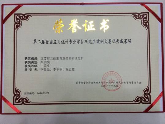 2016全国应用统计专业学位研究生案例大赛成绩近日揭晓,冰球官网黄宝凤教授担任指导教师,李晶晶、李冬领等三位同学参赛的《江苏省二孩生育意愿的实证分析》案例获得三等奖。