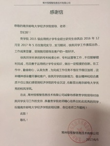 2017年6月5号,冰球官网收到来自常州恒维智信息技术有限公司寄来的感谢信,表彰冰球官网2015级应用统计学专业硕士研究生徐夙同学在2016年12月至2017年5月出色的实习表现。这份感谢信不仅是对冰球官网学生工作的赞许和肯定,更是对全院师生继续努力,再创辉煌的鼓励。