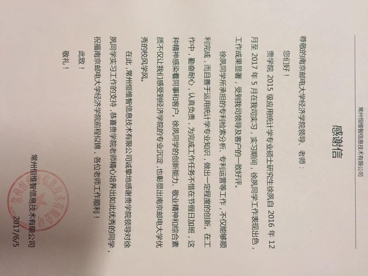 2017年6月5号,冰球官网收到来自常州恒维智信息技术有限公司寄来的感谢信,表彰冰球官网2015级应用统计学专业硕士研究生徐夙同学在2016年12月至2017年5月出色的实习表现。这份感谢信不仅是对冰球官网学生工作的赞许和肯定,更是对全院师生继续努力,再创辉煌的鼓励。