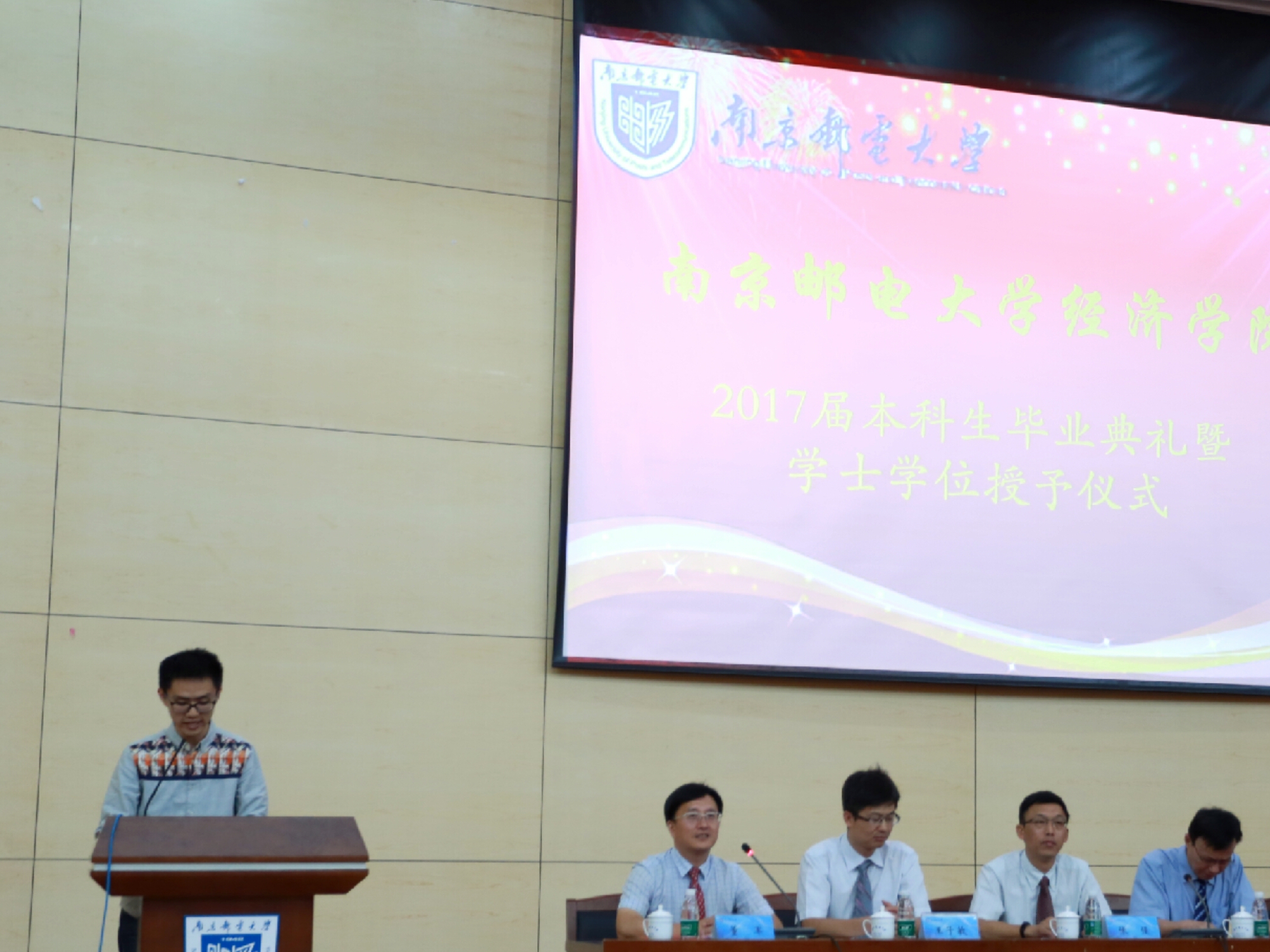 朱永平教授首先致辞发言,特别表扬了四年来在全国各项竞赛中战绩斐然的经院邮子,着重通报了本届学生就业及升学情况,尊重并鼓励莘莘学子多元化的选择。寄语学子走出校园后秉承校风,践行校训,传承南邮人求真务实的治学态度和孜孜不倦的科研精神。