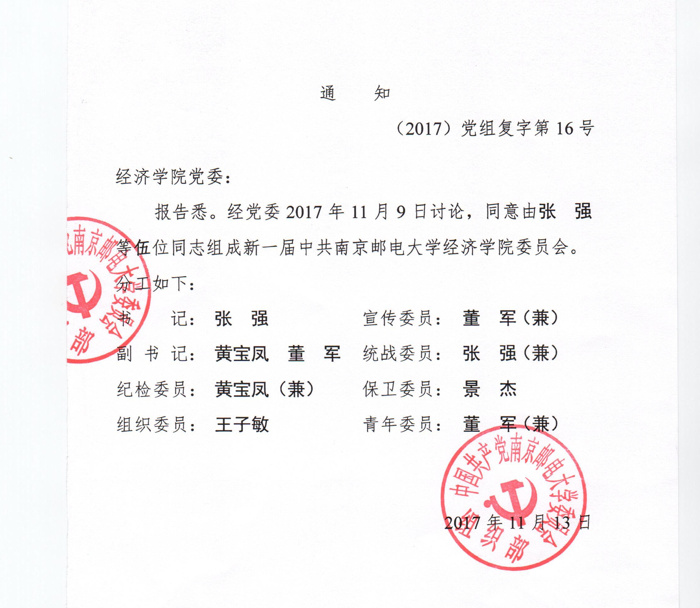 次日,经新一届学院党委委员会议无记名投票选举产生张强同志为党委书记,黄宝凤同志、董军同志为党委副书记,景杰、王子敏同志为党委委员,报请校党委审批。