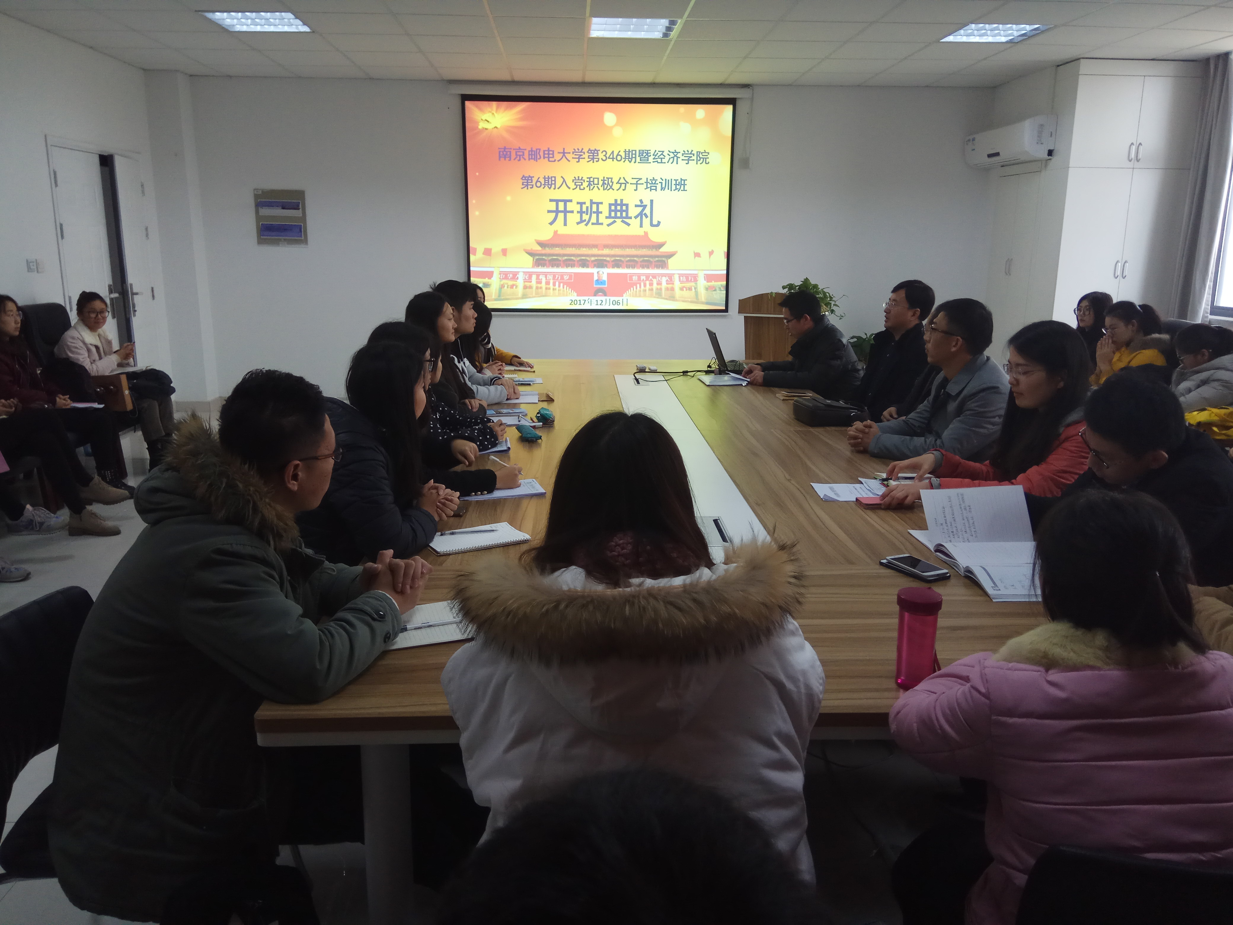开班典礼在雄壮的《国际歌》中拉开了序幕。在开班致辞中,学院党委张强书记向学员强调三点:一、此次党校培训更新了十九大报告、《习近平谈治国理政》(第二卷)、《论共产党员修养》等学习内容,培训学员应该以此为契机,学有所想,学有所获。二、南邮前身是1942年诞生于山东抗日根据地的八路军战邮干训班,现在南邮已经跻身教育部“双一流”建设高校。作为积极向上的有志青年,要有理想,有追求,有文化自信,学员们应端正入党动机,认真学习、掌握党的基础知识,将党章内化于心,作为学习、生活、为人处世的行动指南。三、学员们应珍惜党课培训机会,讲规矩、守纪律的开展每一次小组讨论,带着问题去讨论,作为一名积极分子更应牢记 “全心全意为人民服务”的宗旨,在学习中、生活中积极主动地帮助他人。