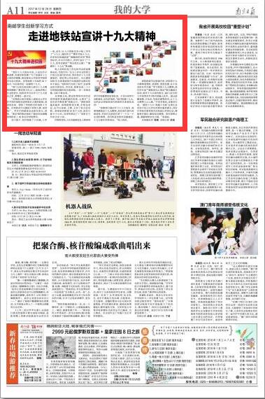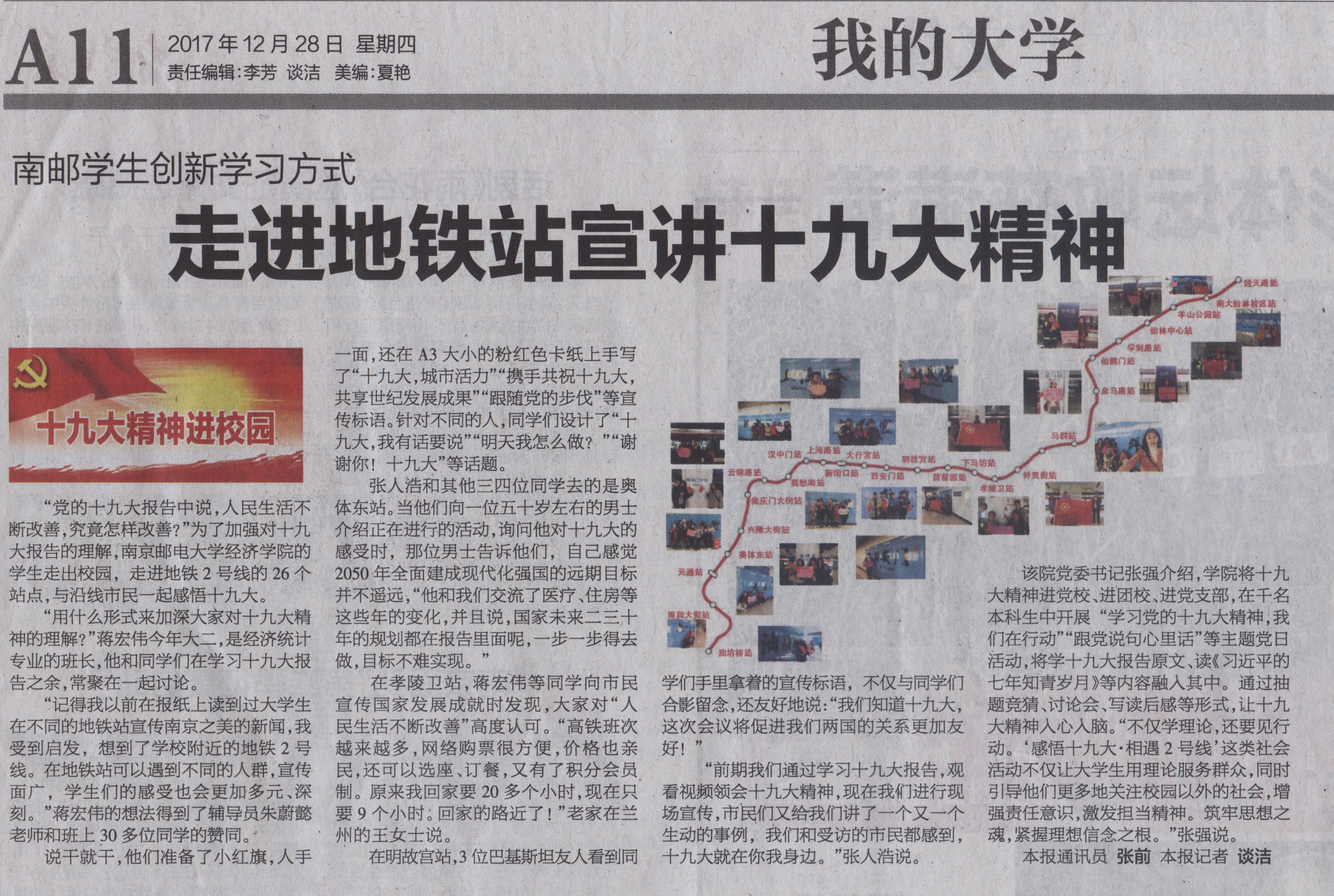 《南京日报》报道冰球官网学生创新学习方式“走进地铁站宣讲十九大精神”