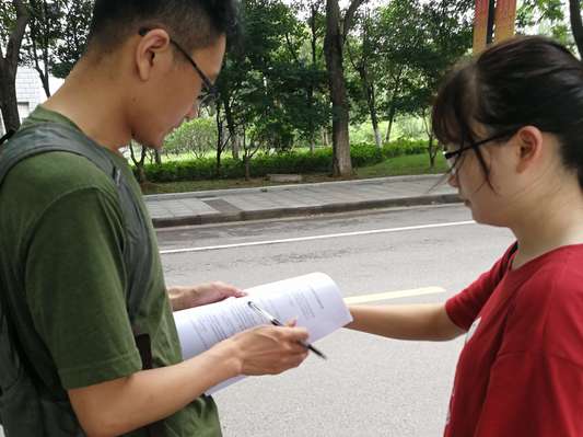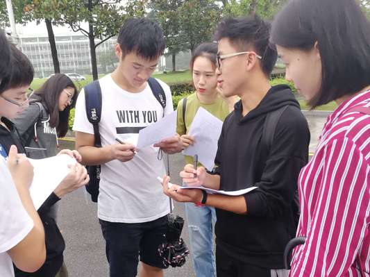 第二天上午9:00,为期三天的纸质问卷收集正式开始。每天出发前小组成员都会在集合地点发起一次小型会议来探讨、计划小组划分、任务分配、问卷填写等相关问题。合影留念后,各小组奔赴负责区域进行实践活动。