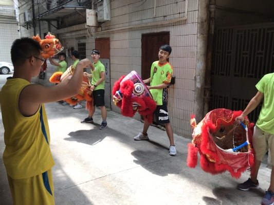 第一天,学员们来到了有 “岭南文化之脉、佛山文化之心”美誉的佛山市禅城区,在国家非物质文化遗产一级继承人何狄强师傅的带领下前往佛山市禅城区龙狮龙舟运动协会青少年训练基地进行实践工作。师傅首先给队员们介绍了南狮的由来、舞狮的发展历史和狮子的含义。随后,队员们开始学习传统舞狮的技巧。在队员们进行了三天的基础训练后,师傅开始让队员们学习传统舞狮的套路,并通过随后一天的训练,让队员们快速地学习传统地狮的套路。在掌握了一定技巧的基础上,队员们开始学习凳桩和高杆舞狮。通过师兄们的表演和师傅的解释,队员们深深感到舞狮要达到“人狮合一”的境界,并通过接下来的艰苦训练,完成了师傅的初步目标和要求。为了更加深入体验岭南文化的传统魅力,品味舞狮的历史精髓,团队一行人在实践期间对黄飞鸿武术馆进行了参观调研,欣赏了黄飞鸿舞狮队表演的高桩舞狮,进一步了解到舞狮文化的博大精深。