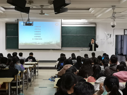 王老师首先对大一学生从入学以来的适应状况做了阶段性总结,对大一学生积极参加学校各类学习服务型活动给予了肯定。王老师从课堂纪律、期中考试、四级备考、宿舍状况、班风建设等方面为大一新生给出了建议和指导。王老师要求学生在校期间按时参加学校教学计划规定一切课程活动,遵守课堂纪律,认真听课,不迟到不早退;要内化自己的道德修养,转化成自觉行为;要提高自主学习能力,为即将到来的期中考试、四级考试制定详细合理的的复习计划,积极备考,诚信应考。