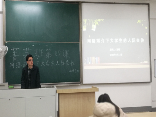 2019年3月22日晚,冰球突破mg正规官网第三十四期大学生菁英人才学校暨冰球突破mg正规官网学生骨干培训班第四课在教3-303教室开展。本次课程由冰球突破mg正规官网2018级辅导员王珏老师主讲,主题为《网络媒介下大学生的人际交往》。