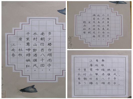 在完成前两天坐姿及握笔矫正、汉字间架结构复习、易错字笔画顺序强调、行文中篇幅大小布局等基本功教学基础上,志愿者根据各年级知识掌握程度不同,挑选出不同的古诗词让孩子们进行学习成果展示。孩子们十分珍惜与志愿者们相处的最后一堂课,书写过程中显得格外认真,每写一个字之前仔细回想着志愿者们叮嘱的注意点,小心翼翼地书写着一笔一划,用自己最好的状态呈现出最完美的书法作品,来回馈志愿者们这些天来的辛苦付出。