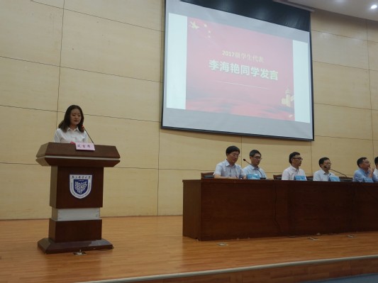 2017级经济学专业的李海艳同学作为本科生老生代表发言,她希望学弟学妹们在大学期间大胆尝试,探索未知领域,独立清醒、敏锐自知,遇到更好的自己。