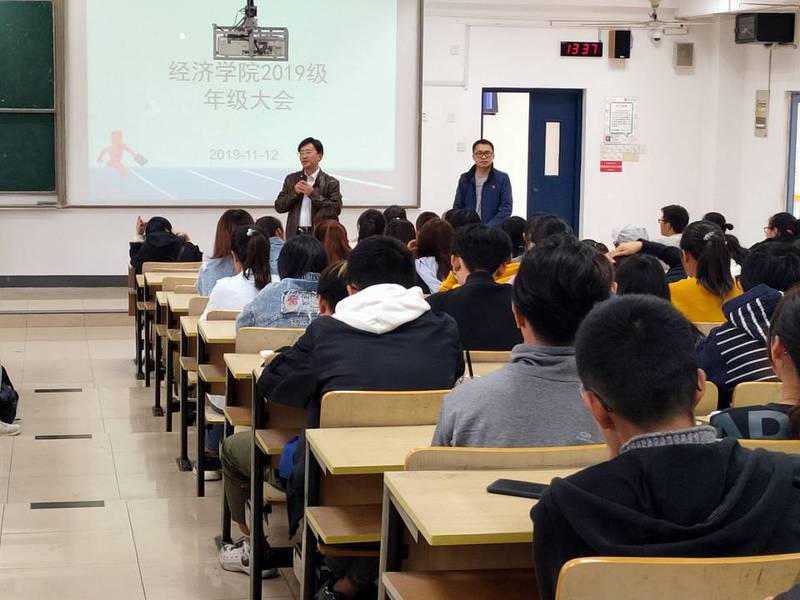 2019年11月12日下午,冰球突破mg正规官网2019级本科生在教3-300教室召开2019-2020学年第二次年级大会。冰球突破mg正规官网党委董军副书记,原2019级辅导员王超老师,2019级辅导员朱蔚懿老师,2019级辅导员助理黄海生老师及2019级全体学生参加了本次年级大会。会议由王超老师主持。