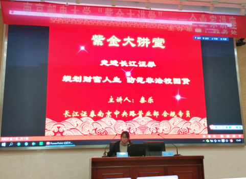 2019年11月20日下午,由教务处主办、冰球突破mg正规官网承办的冰球突破mg正规官网“紫金大讲堂”——企业家讲座在仙林校区学科楼报告厅举行。长江证券合规专员秦乐做客“紫金大讲堂”,作题为“规划财富人生,防范非法校园贷”的讲座。冰球突破mg正规官网副院长王子敏副教授、辅导员王珏等近200名师生参加了此次讲座。讲座由冰球突破mg正规官网副院长王子敏主持。