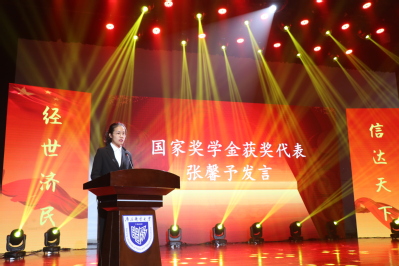 国家奖学金获得者张馨予同学作为获奖代表发言。她从自身经历出发,讲述了自己如何兼顾学业、竞赛、社团等多面挑战,取得优异成绩,充实地度过了两年多的大学时光。她希望同学们都能踏实地走好每一步,积跬步而至千里、积小流而成江海,绘制出自己的绚烂画卷。