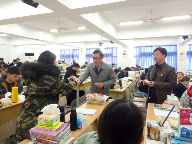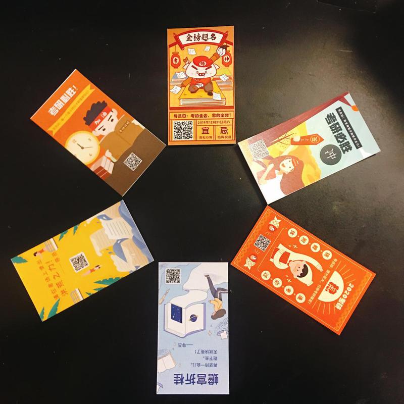 领导老师们鼓励考研学子持之以恒,坚持不懈,并亲手送上学院精心准备的锦囊和福气卡,希望大家“身揣锦囊妙计,怀抱一身运气,提笔从容淡定,考出傲人成绩”。锦囊里装满了各色助力小零食,有寓意“智慧满满”的山核桃、“能量多多”的士力架、“提神醒脑”的薄荷糖、“好事连连”的好时巧克力和“锐意进取”的瑞士糖。考研福气卡由辅导员朱蔚懿带领毕业班学生党员精心设计,印有鼓舞人心的考研祝福和励志歌曲二维码,祝福大家旗开得胜、马到成功。经院考研学子惊喜于这份冬日里的暖意,纷纷表态将一鼓作气、坚持到底、不负众望。