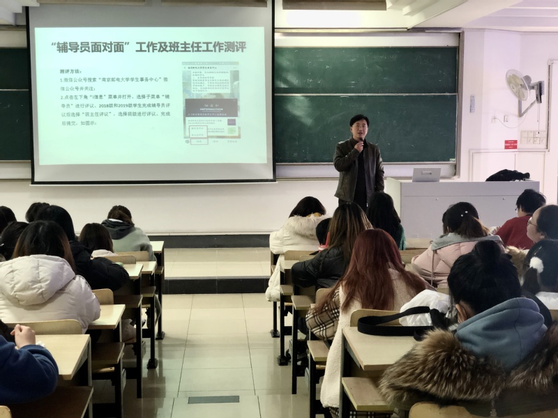 首先,王老师对同学们即将来临的期末考试和英语四、六级考试进行叮嘱并给予期望,指出大家应当在期末努力复习,认真备考。接着又就当前的学风情况进行分析,强调在大二及之后的学习生活中要重视竞赛机会,注重对自我实力培养,在寒暑假时间中把握好实习的机会,夯实专业基础,培养核心竞争力。针对同学们的生活情况,王珏老师提出要多关心父母、多与父母沟通,注重宿舍卫生问题、人际交往问题。最后董书记带领大家进行辅导员面对面测评、班主任测评工作并对大家提出增强学习能力,努力学习,注重自我品德、道德修养的要求。