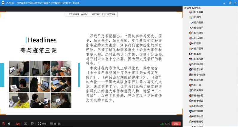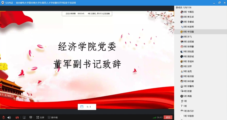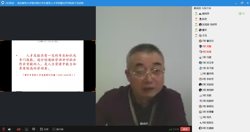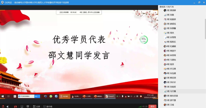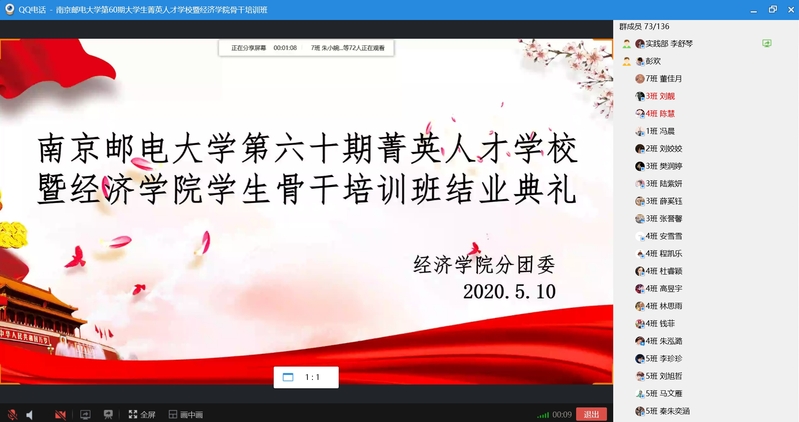 2020年5月10日下午,冰球突破mg正规官网第60期菁英人才学校暨冰球突破mg正规官网学生骨干培训班结业典礼在线上顺利举行。校关工委副主任、原冰球突破mg正规官网党委书记储成祥教授,冰球突破mg正规官网党委董军副书记,冰球突破mg正规官网辅导员王珏老师,以及培训班全体结业学员参加了本次结业典礼,活动由2019级申羽霞同学主持。