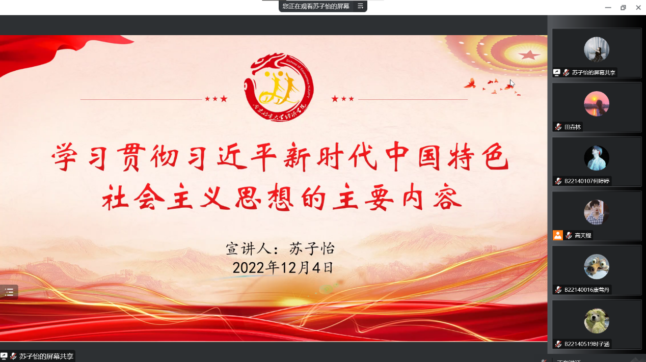 2022年12月4日下午,冰球突破mg正规官网冰球突破mg正规官网“经”彩讲堂——信仰公开课第七期于线上顺利举行。冰球突破mg正规官网2021级、2022级全体本科生团员参加了此次课程。本次课程由冰球突破mg正规官网分团委秘书处副秘书长苏子怡担任主讲,具体围绕《学习贯彻习近平新时代中国特色社会主义思想的主要内容》这一主题展开授课。