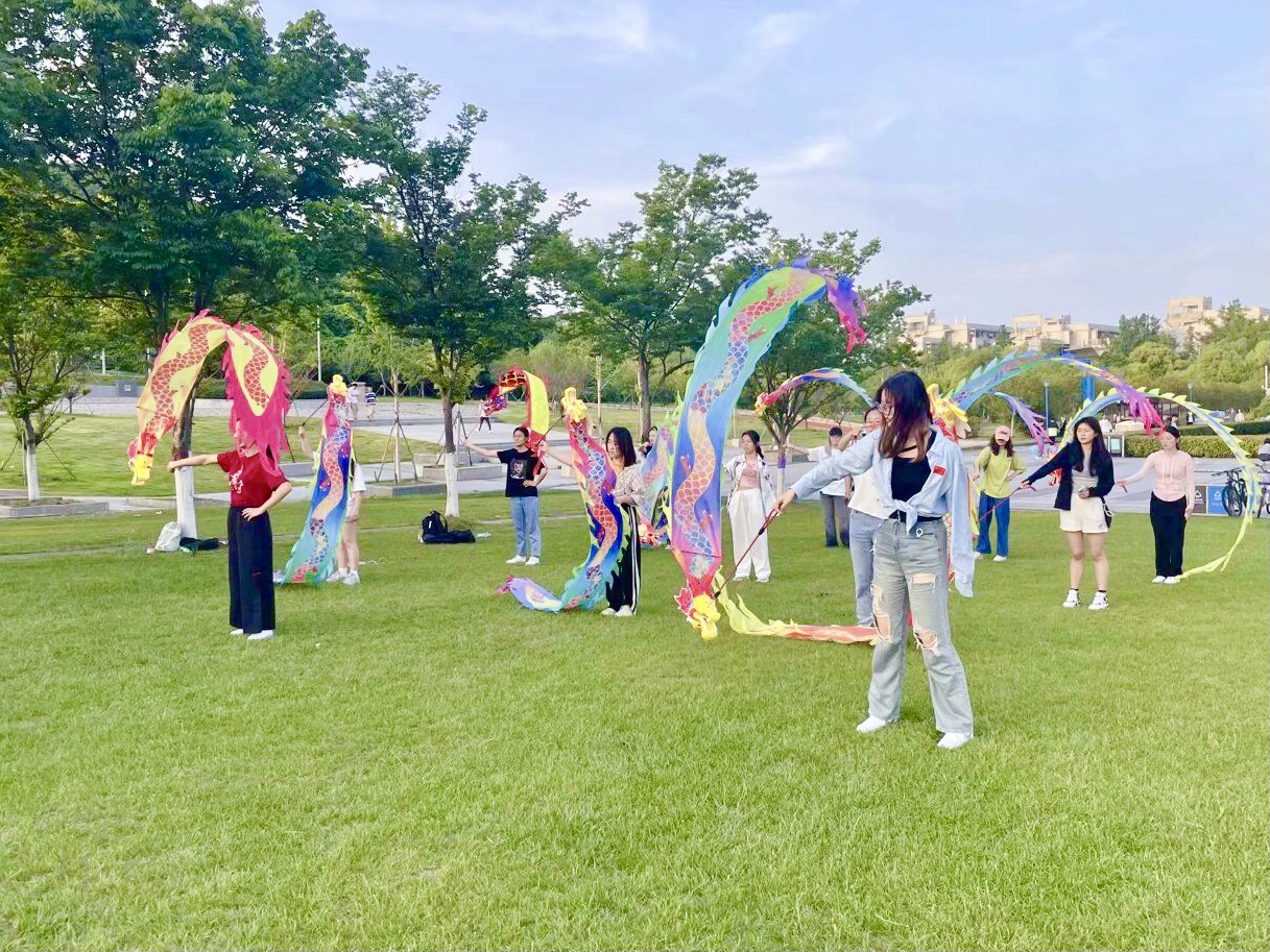 同学们在户外学习龙狮舞蹈