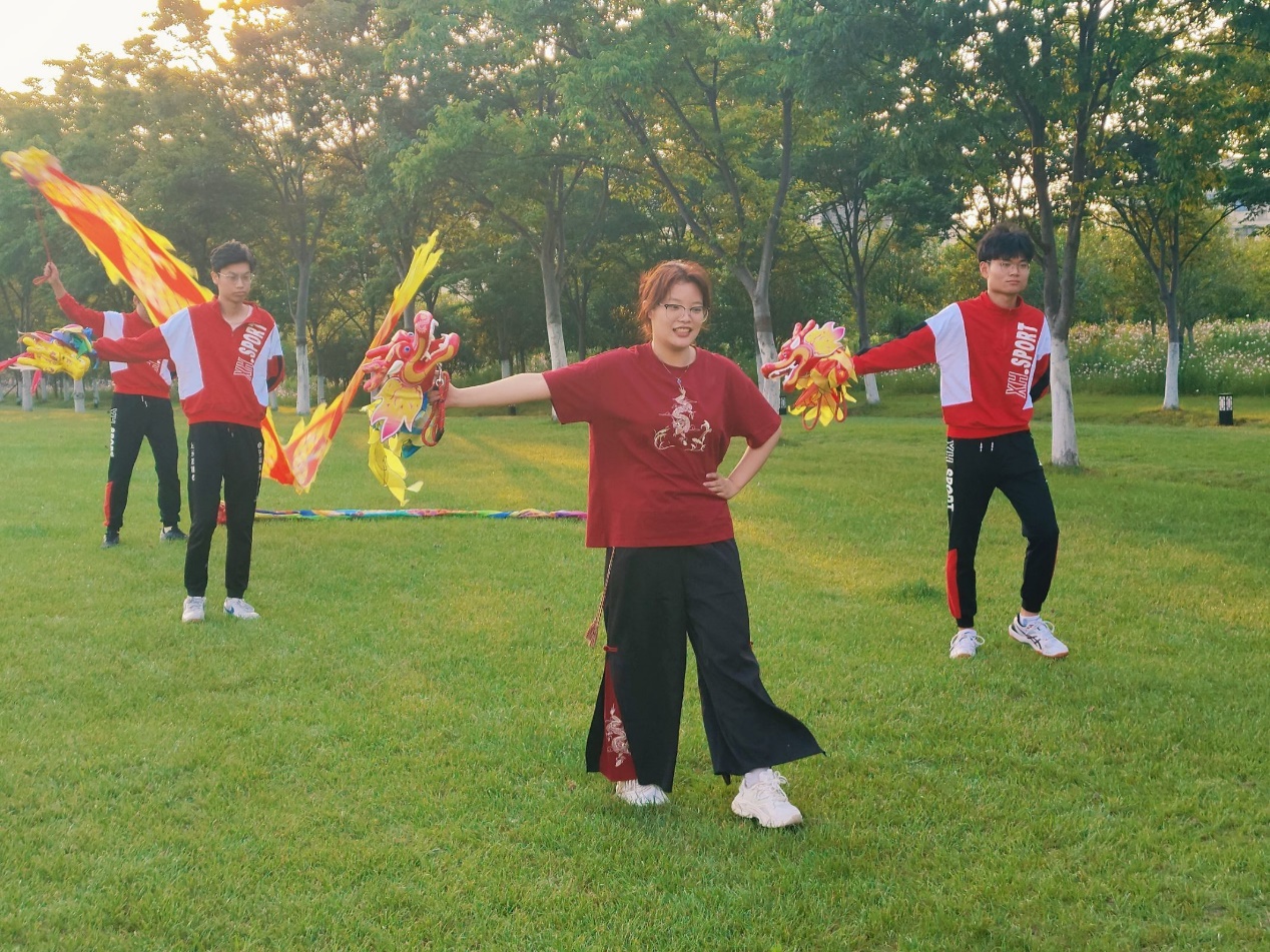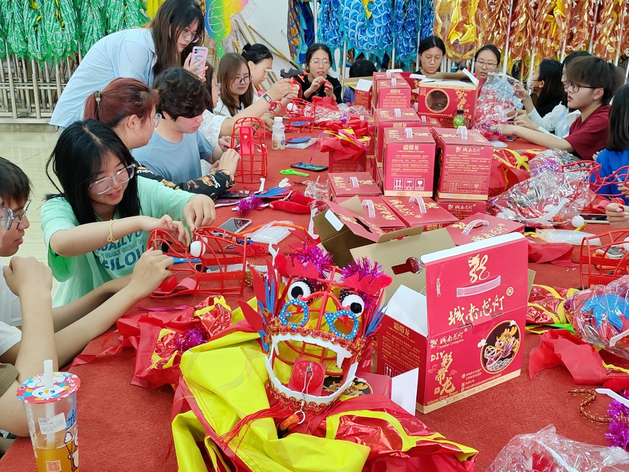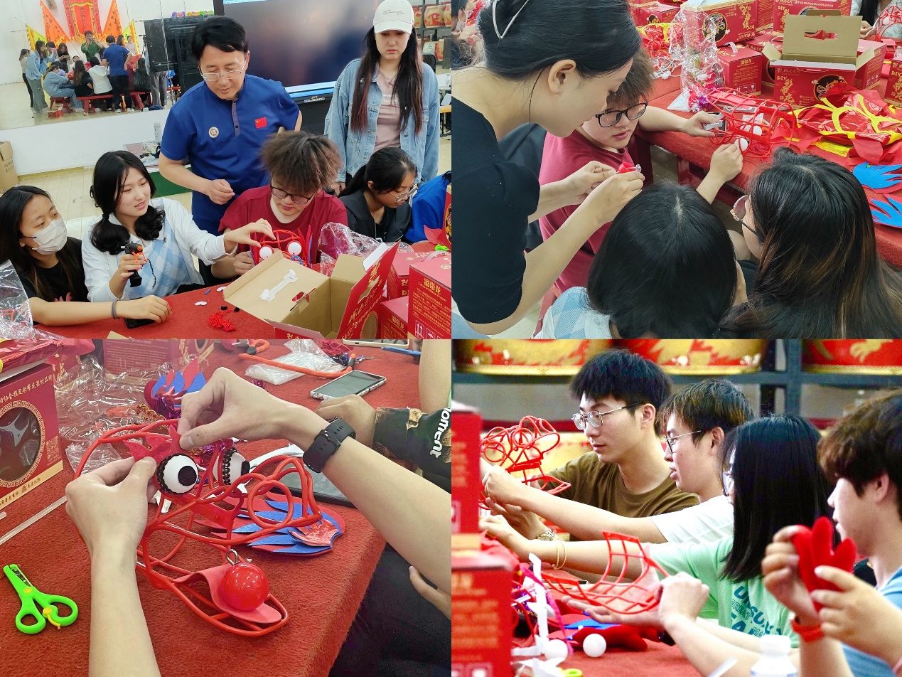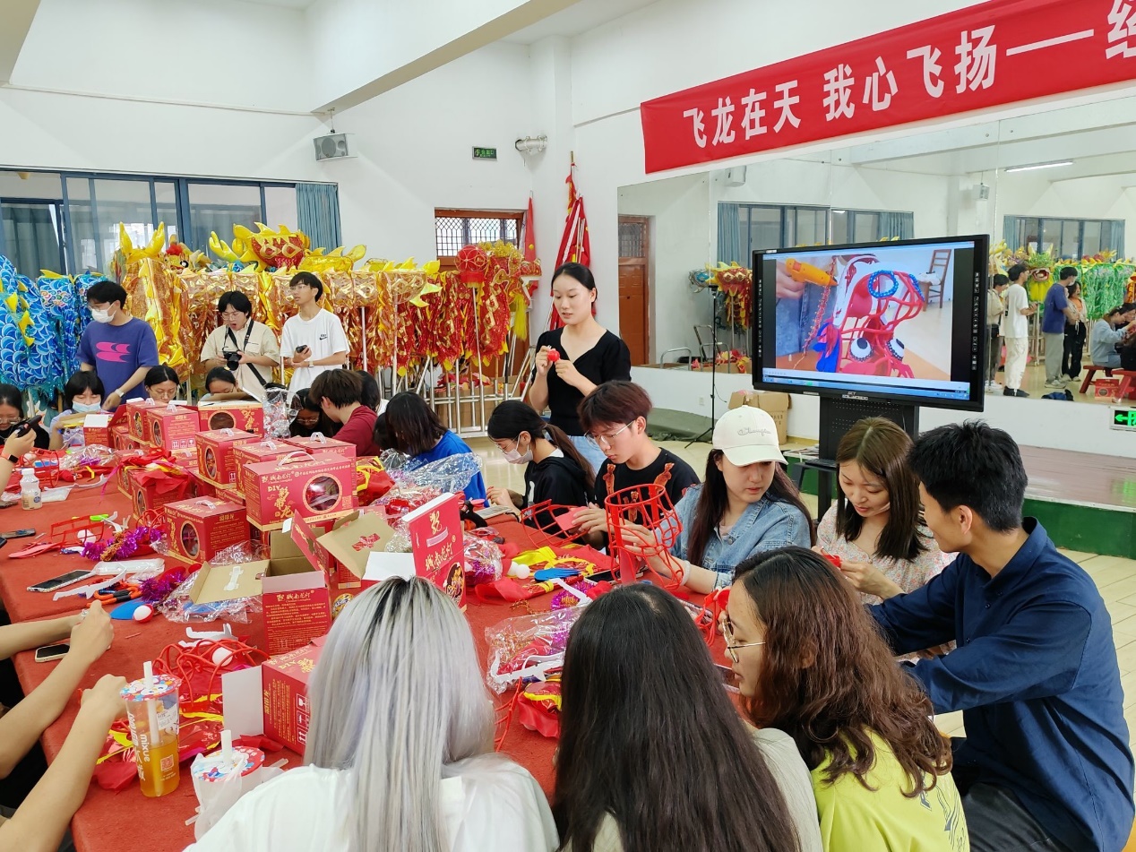 活动伊始,董军书记发表讲话,董书记作为国家级龙狮裁判员、教练员,从专业角度介绍了龙狮运动的发展史、龙狮运动技巧,鼓励大家积极参与传统文化活动,树立文化自信。刘晶晶老师讲解了本次DIY的城南龙灯构造,号召同学们传承弘扬中华优秀传统文化。储宜旭老师希望本次活动能够加强同学们之间的合作交流,在传统龙狮文化的熏陶中舒缓压力,并提醒大家在动手过程中注意安全,小心使用相关工具。接着,陈若萱同学为大家现场演示教学,同学们纷纷动手体验、分工合作,全身心投入到手工制作中,制作龙舌、装饰龙头,通过集中注意力,让身心放松,感受城南龙灯扎作的深厚底蕴和中国传统文化中的工匠精神。活动过程中,董书记亲自指导,各位老师们也与同学们一起参与制作。DIY完成后,陈若萱同学为大家现场示范彩带龙舞蹈,意犹未尽的同学们来到户外大草坪,观看龙狮团同学表演的彩带龙舞,龙狮团张静怡同学还对彩带龙动作进行拆分讲解,现场示范动作要领,大家拿上自己亲手制作完成的彩带龙,跟着演示让手中的彩带龙起舞,在龙舞的上下腾飞中,在场同学们的心情也随之飞扬,身心都得到了极大的舒展,更深刻地感受到了中华传统龙狮之美。