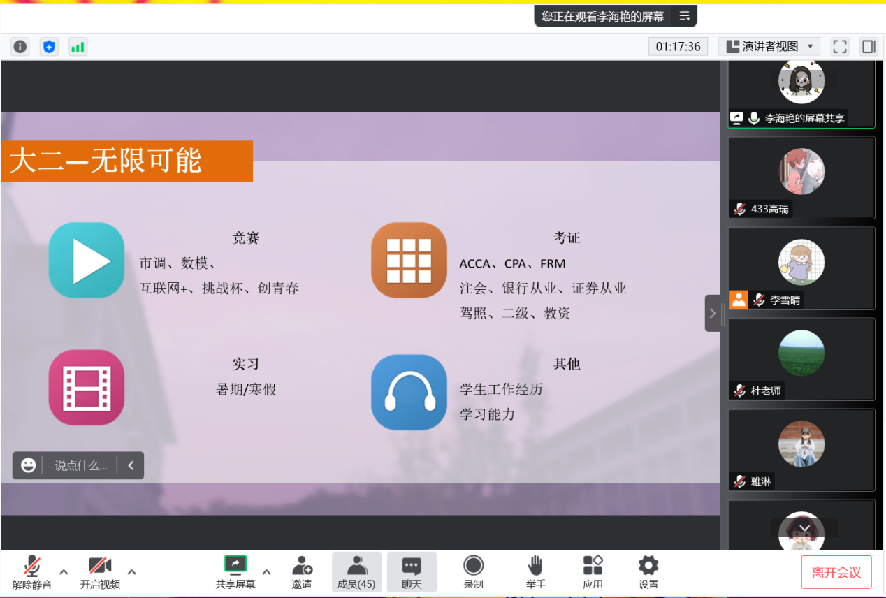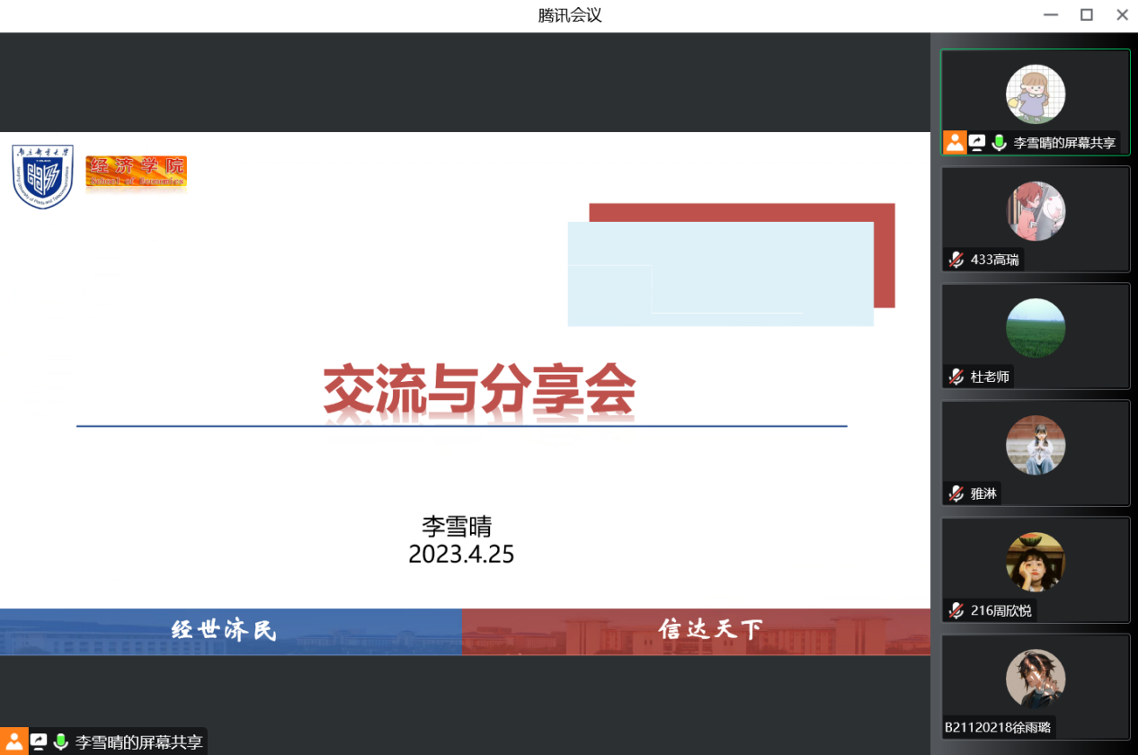 为帮助大二经济学专业学生明确奋斗目标,制定未来规划,2023年4月25日,冰球突破mg正规官网研究生李雪晴、唐咏仪、李海艳为大二经济学专业学生开展了经验分享。本次活动通过线上进行,班主任杜运伟老师、张雅淋老师受邀参会。会议由杜运伟老师主持。