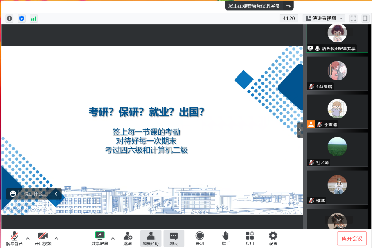 经验分享活动结束前,班主任杜运伟老师进行了总结发言。杜老师鼓励同学们要积极向优秀看齐,尽快找准奋斗目标,脚踏实地努力进取,让大学生活过得充实有意义。
