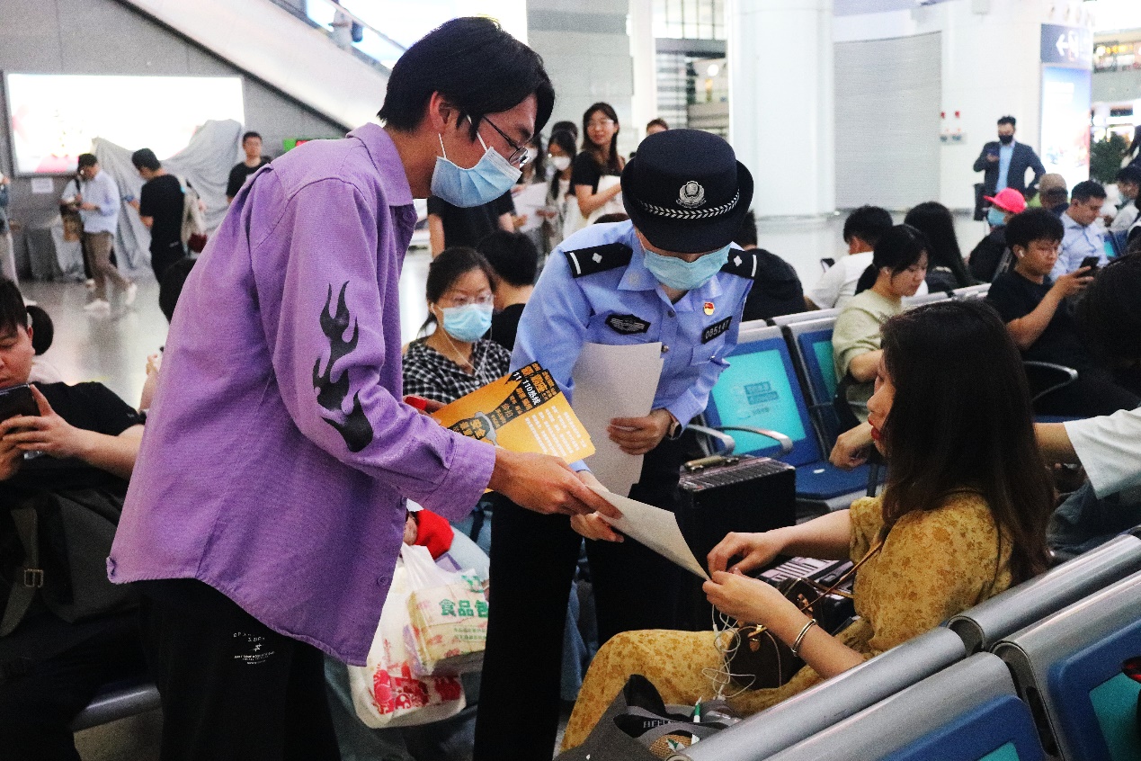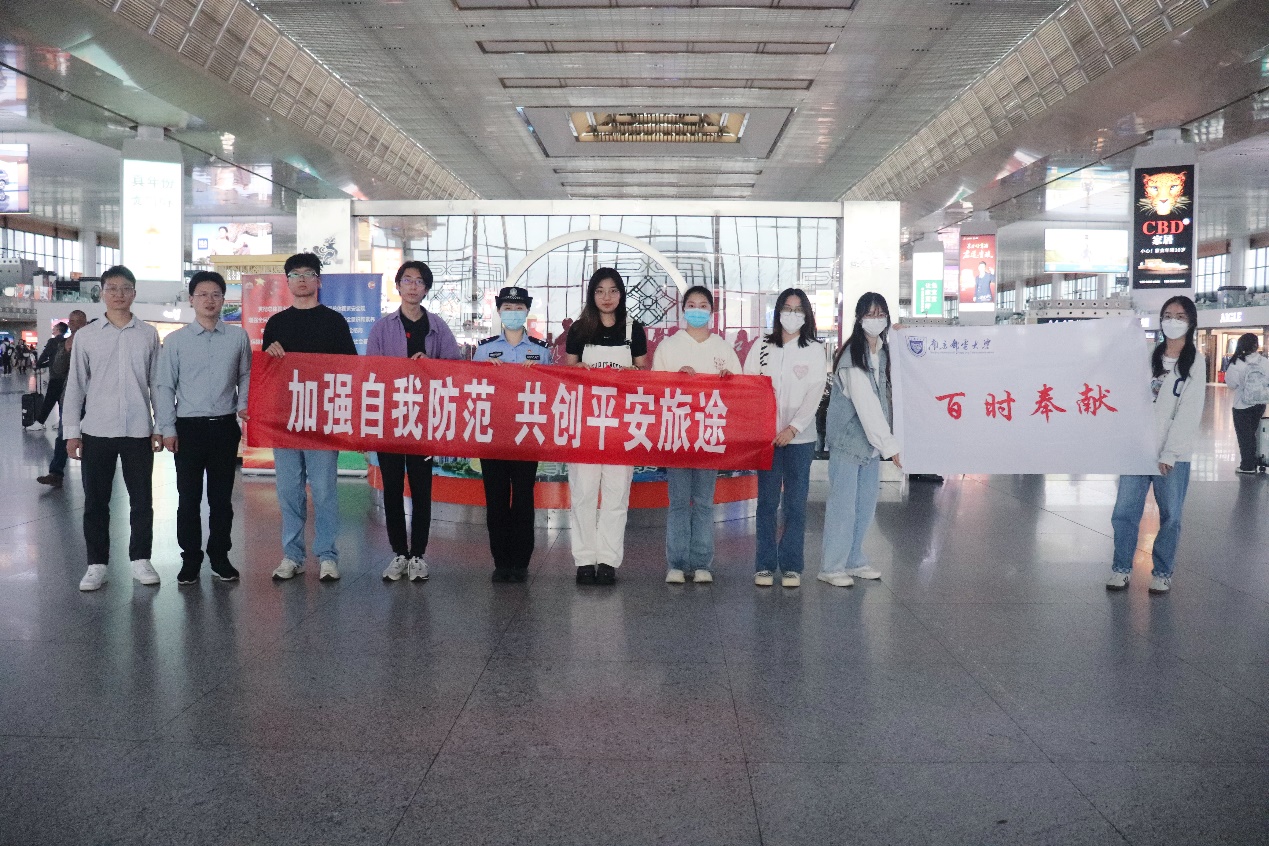 最后,在南京南站派出所团支书刘怡辰的带领下,学院师生党员在南京南火车站内开展了百时奉献-普法宣传活动,向在候车区的旅客分发法制宣传页,进行法制宣传讲解,在强化了自身法律意识的同时,利用所学所知向群众进行宣传,锻炼了自身的能力,发挥了先锋模范作用。