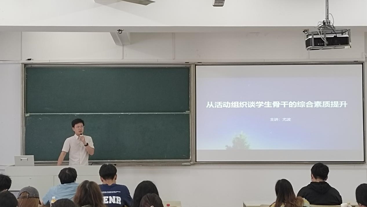 2023年10月19日中午,冰球突破mg正规官网第一百四十二期大学生菁英人才学校暨冰球突破mg正规官网骨干培训班第六次课于教2-519顺利举行。本次课程的主讲人为尤波老师,具体围绕《从活动组织谈学生骨干的综合素质提升》这一主题展开授课。