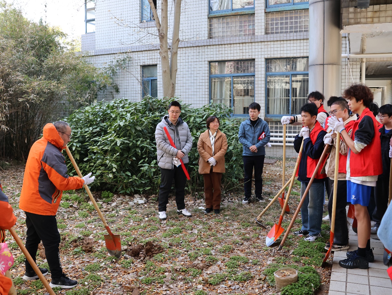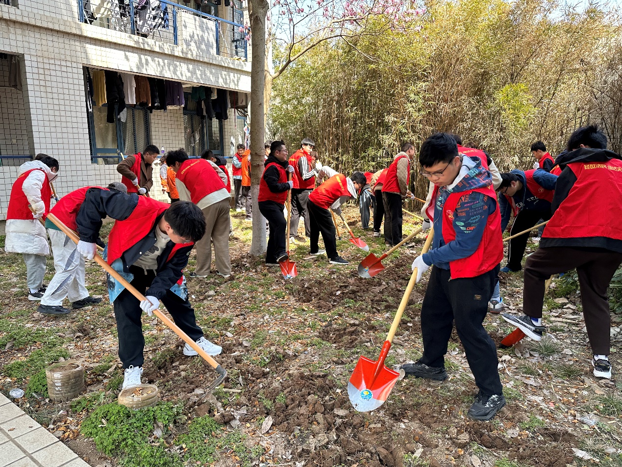 同学们手提铲具、锄具,在老师及宿舍管理员的指导下,井然有序地开始了绿植养护工作,挥锹铲土、拔除杂草、捡拾砖块、松化土质,分工有序,共同为这片土地增添新机,并与宿管阿姨共同讨论这块土地的种植计划,期待自己亲手劳作的地方未来变得绿色葱郁、果实丰硕的样子。