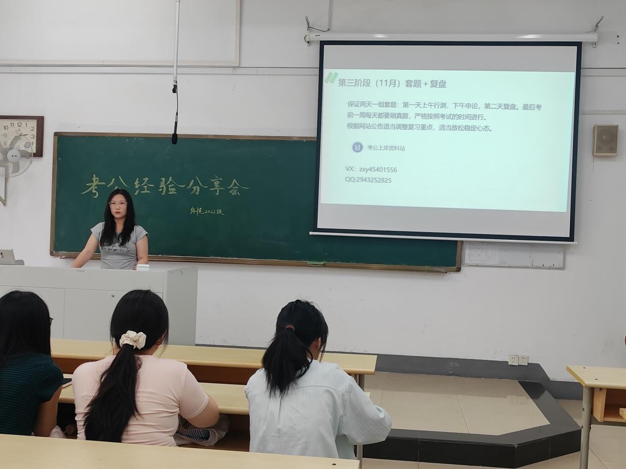 为助力2022级学生了解公务员考试、明确备考方向,学院于6月12日下午在教4-105教室举办考公经验分享会,特邀2025届成功考取公务员的周欣悦、谭心钥两位同学担任主讲。