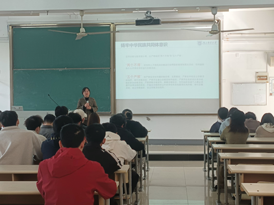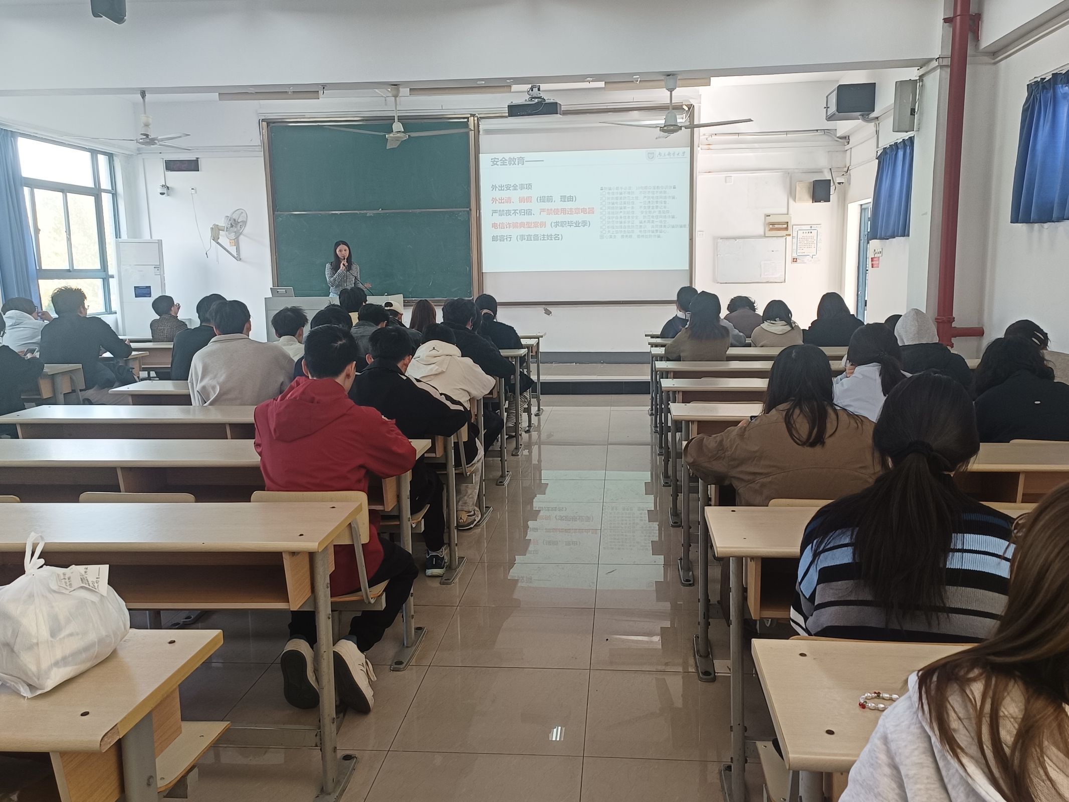 随后,吴书记开展“铸牢中华民族共同体意识”教育,详细解读“两个不得五个严禁”,并结合典型电信网络诈骗案例,深入普及防范知识,切实提升学生的安全意识与风险应对能力。最后,储宜旭老师就安全教育与日常管理作具体说明,强调外出报备与请假规范,并重申宿舍严禁使用违章电器,杜绝火灾隐患,切实维护校园安全稳定。