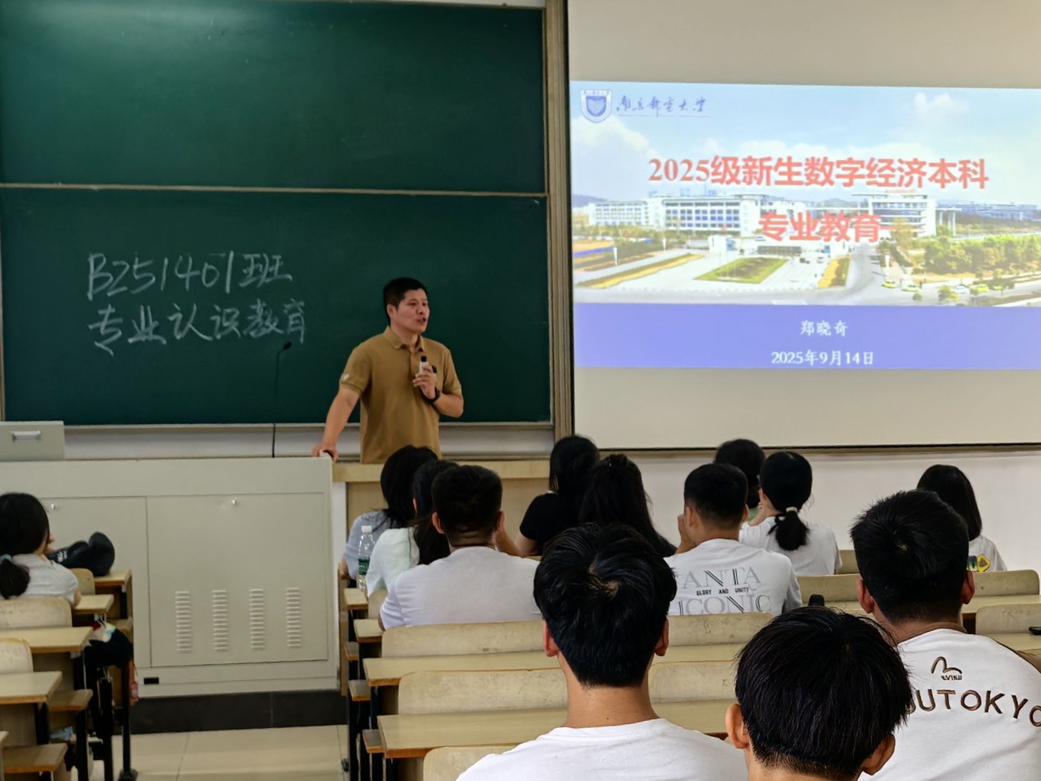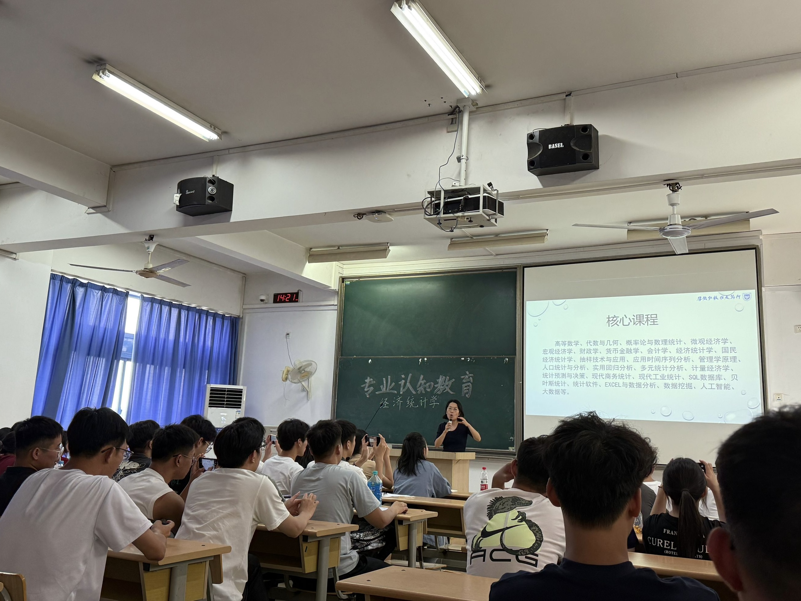 风华正茂,扬帆起航。冰球突破mg正规官网冰球突破mg正规官网迎来了朝气蓬勃的2025级新同学。为帮助新生深入了解专业内涵,科学规划学业发展,学院于9月14日下午14时分别在教2-403,教2-404,教2-405组织开展了新生专业认知教育活动。经济系郑晓奇老师、经济统计系易莹莹老师、金融系程铁军老师担任主讲人,2025级全体新生分专业参与此次活动。