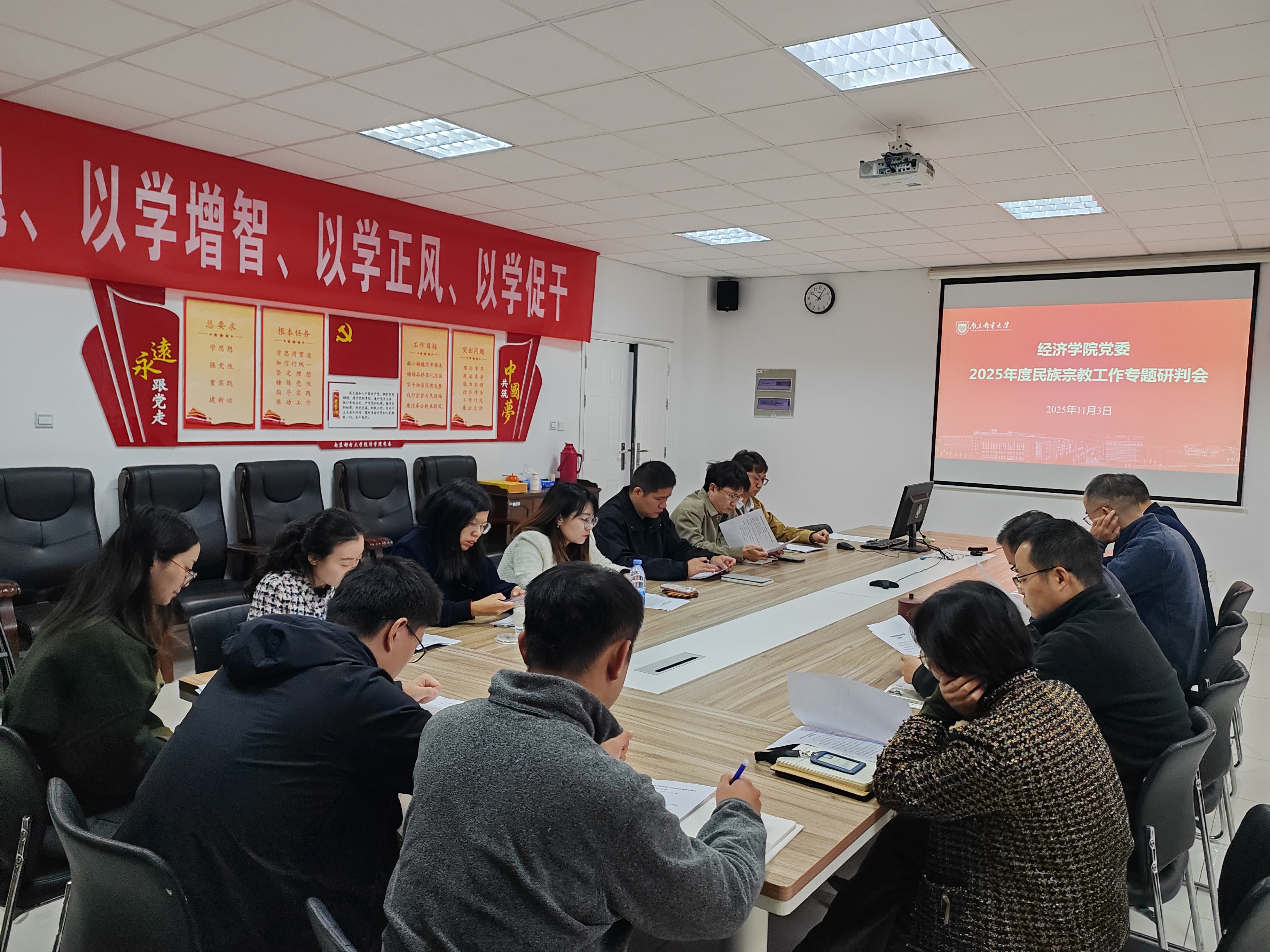 为深入学习贯彻党的二十大和二十届二中、三中、四中全会精神,持续推进党建目标任务落地落实,为学院高质量发展提供坚强组织保障,2025年11月3日上午,冰球突破mg正规官网党委在文科楼529会议室召开2025年度党建工作推进会。会议由学院党委书记刘挺主持,学院党委委员、各党支部支部书记参加。