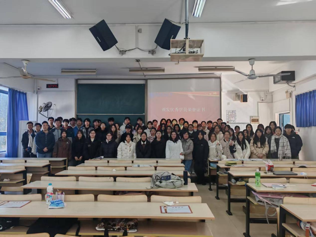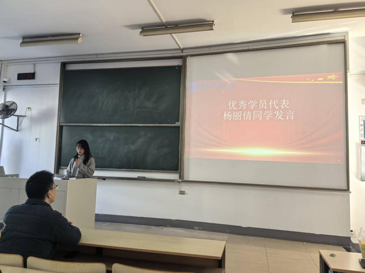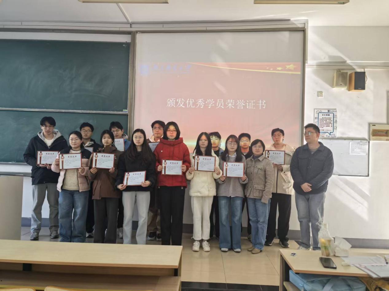 优秀学员代表杨丽倩同学在发言中分享了在菁英班的成长感悟。她将这段时间的学习概括为转变二字,展现了自己的成长轨迹,通过系统的理论学习和丰富的实践活动,不仅拓宽了知识视野,提升了综合能力,更在团队协作中收获了真挚友谊。她衷心感谢学校提供的优质平台和老师们的悉心指导,承诺将把在菁英班的所学所悟转化为前进动力,在未来的学习工作中继续发挥模范带头作用。随后,吴迪老师和王珏老师共同为优秀学员颁发荣誉证书,并与他们合影留念。这份荣誉既是对获奖学员勤奋学习、积极表现的充分肯定,也是对全体学员的激励和鼓舞。